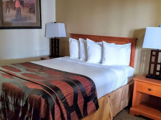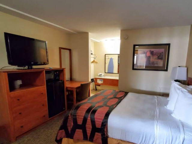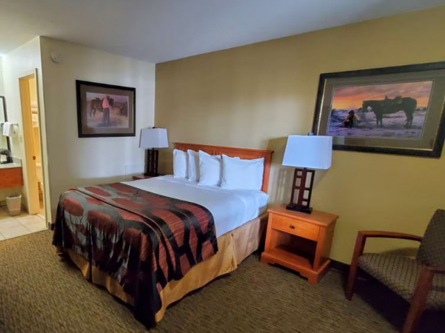 The guest room offers one king bed, a private bathroom, a microwave, and a mini-refrigerator.